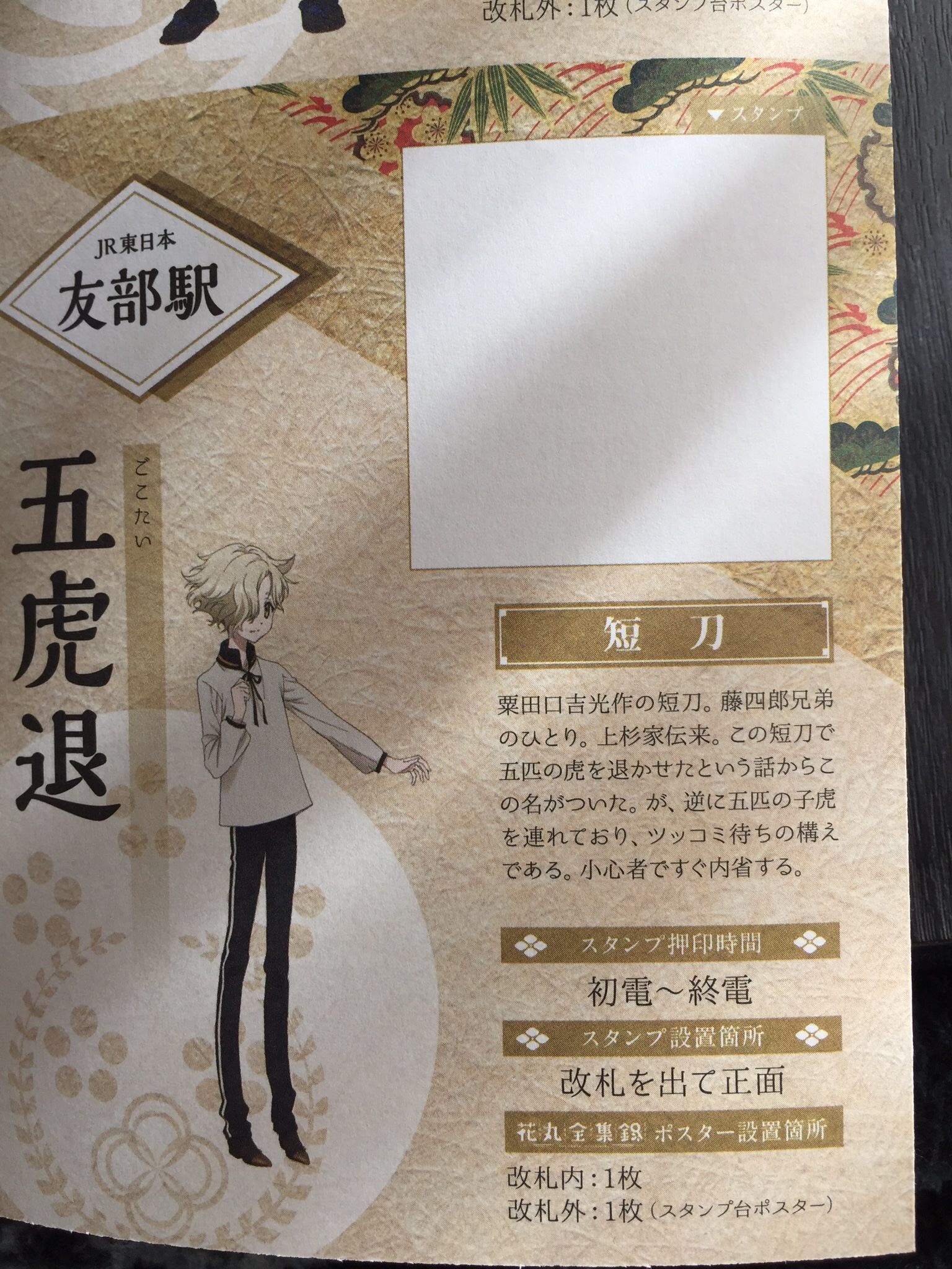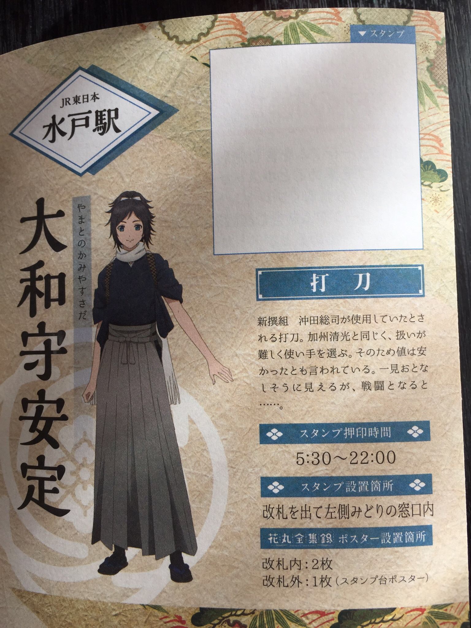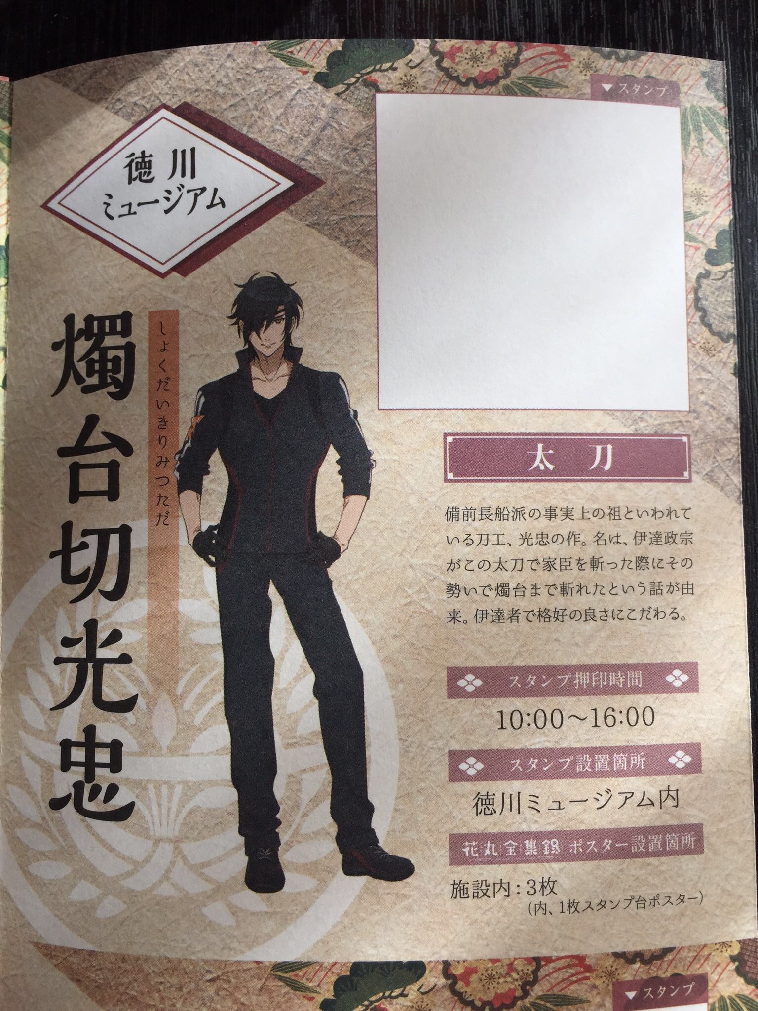 このスタンプ台紙である小冊子に、それぞれキャラクターの名刀の説明、そしてスタンプ設置場所、時間も詳しく載ってます。