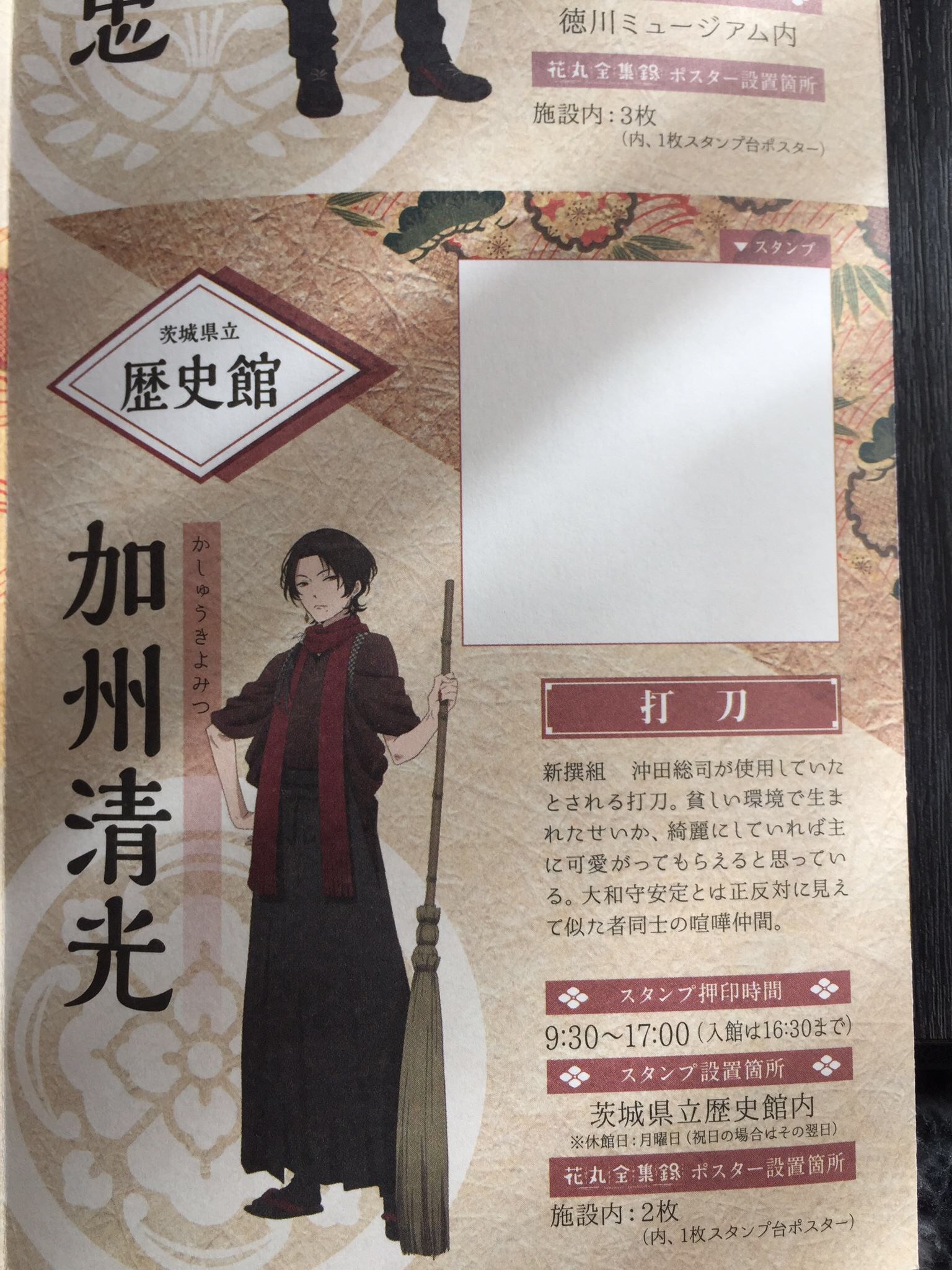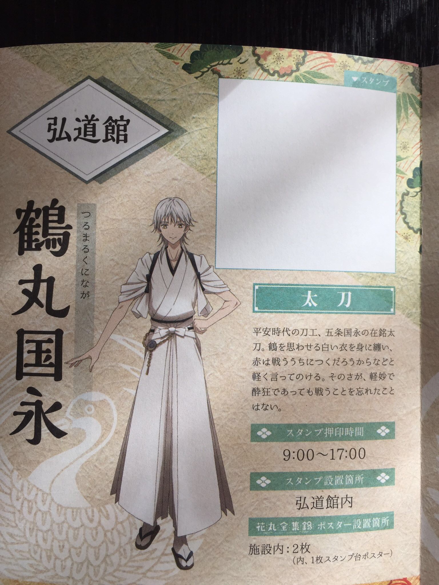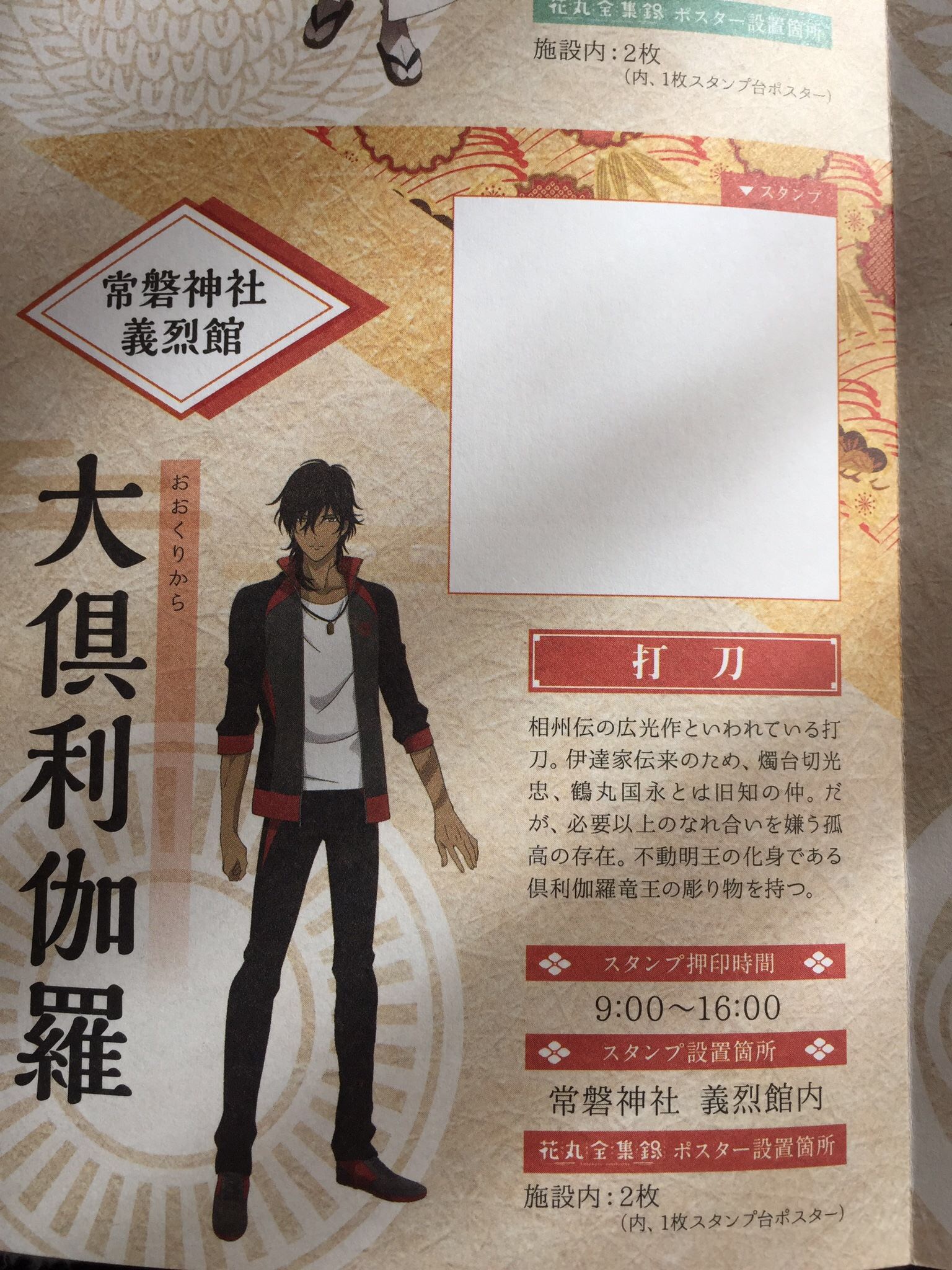 このスタンプ台紙である小冊子に、それぞれキャラクターの名刀の説明、そしてスタンプ設置場所、時間も詳しく載ってます。