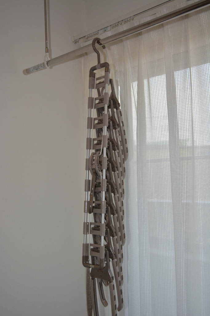 そして、使わない時は畳んでおきます。縦に細くなるので、省スペース。クローゼットの中にかけておく事も出来るかな。